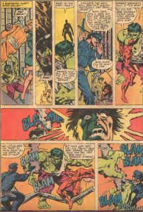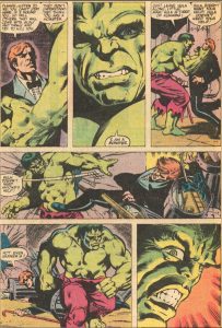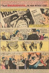 Which he does in less than two pages. Â It’s interesting that Matt remarks how big The Hulk is, because by today’s standards he’s relatively normal sized in comparison. Â Anyway Matt “finds” The Hulk, don’t forget Matt is blind and has to rely on his radar, and he attempts to reason with Bruce Banner’s monster alter ego.