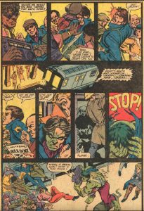 Bruce makes two mistakes– 1. he takes the subway where people are obnoxious and pushy and are just generally annoying and 2. this is the late 70s and THE INCREDIBLE HULK TV Series is in full swing where Bruce Banner (in the show he’s called David) is constantly being turned into The Hulk everytime someone is obnoxious, or pushy or generally annoying, so he Hulk’s out on the train.