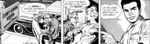 In 1962 Adams began drawing the Ben Casey comic strip which was based on the popular TV show of the time with the first daily strip bearing his name appearing Nov 26, 1962. In 1964 a color Sunday strip was added which Adams also produced all the while maintaining his work in advertising because his family “wasn’t wealthy and needed the money”. Over the years Adams has claimed the strip ran in anywhere from 165 to 365 daily newspapers before coming to an end when the series was cancelled in 1966.